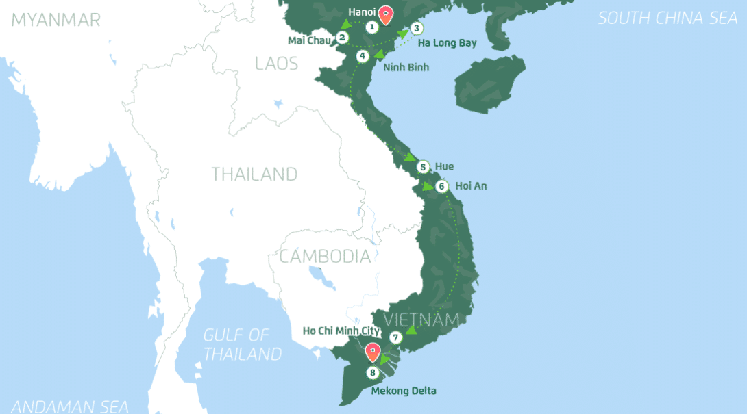 From there, venture into the picturesque mountains of Mai Chau. Live with local minority groups in traditional stilt houses, cycle through emerald rice paddies, and learn age-old crafts. You’ll kayak on serene lakes, hike through lush nature reserves, and experience the warmth of Vietnamese hospitality firsthand.